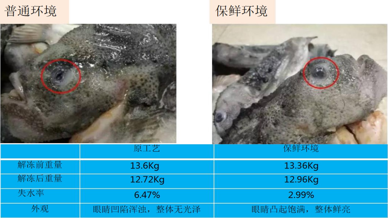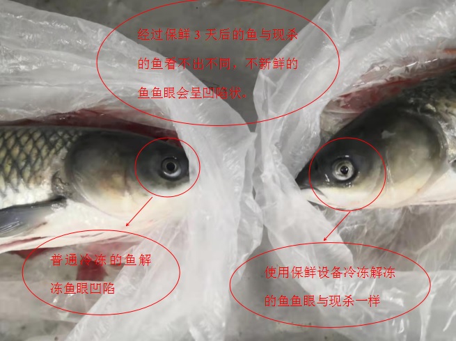 传统渔业运输、冷冻解冻保鲜方式与加入静电保鲜机后的冷冻解冻效果对比